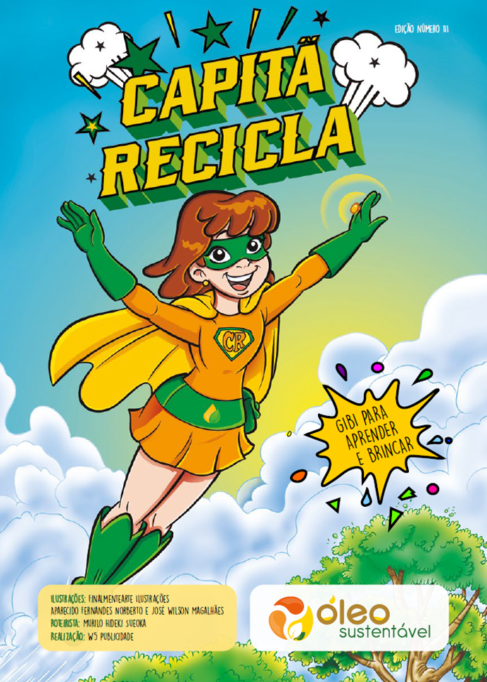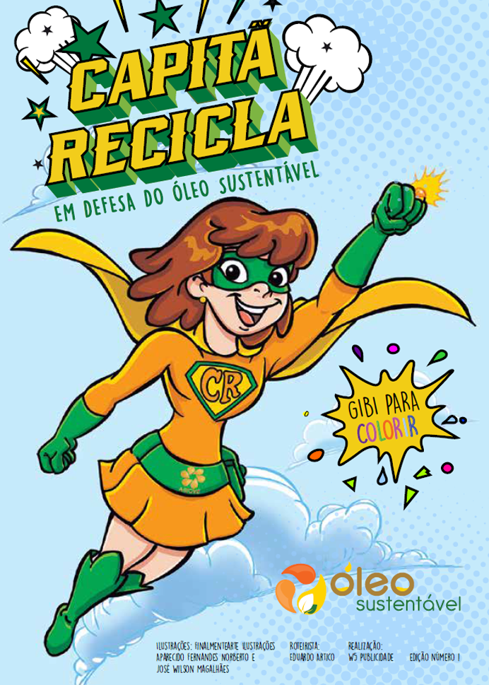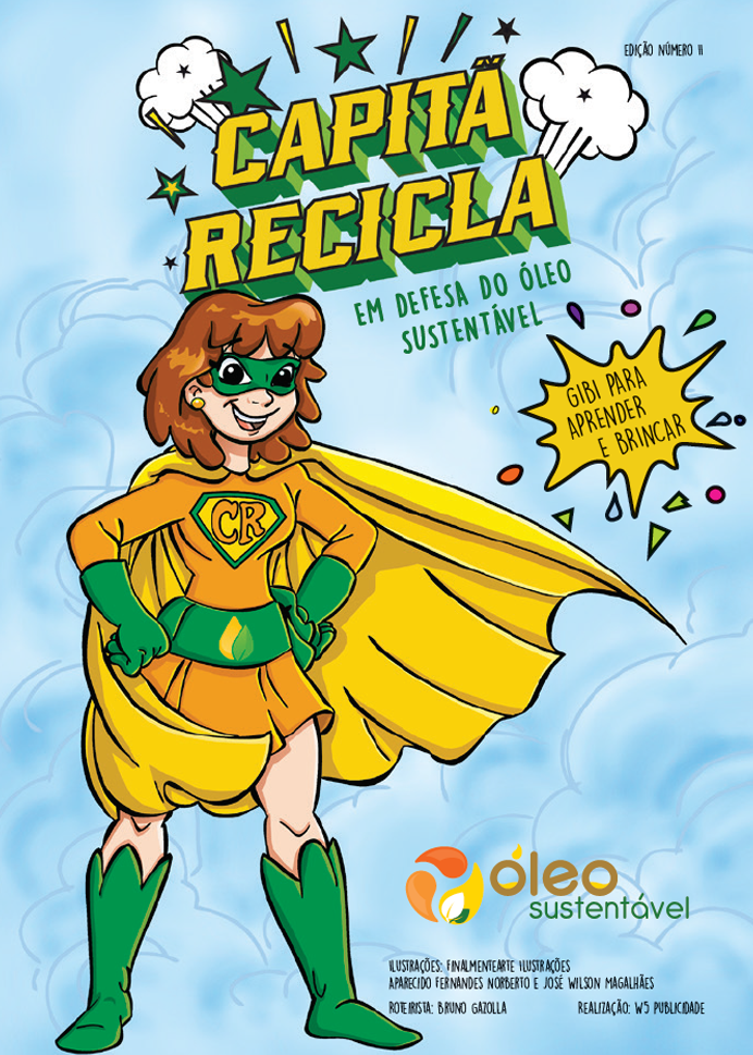 Essa é a Capitã Recicla, criada pela Abiove para inspirar e educar crianças, jovens e adultos sobre a importância do descarte correto do óleo de cozinha, da reciclagem e muito mais. Ela possui superpoderes, como o Anel do Conhecimento, o Raio Reciclador, além de seu Cinto de Utilidades, repleto de ferramentas incríveis.